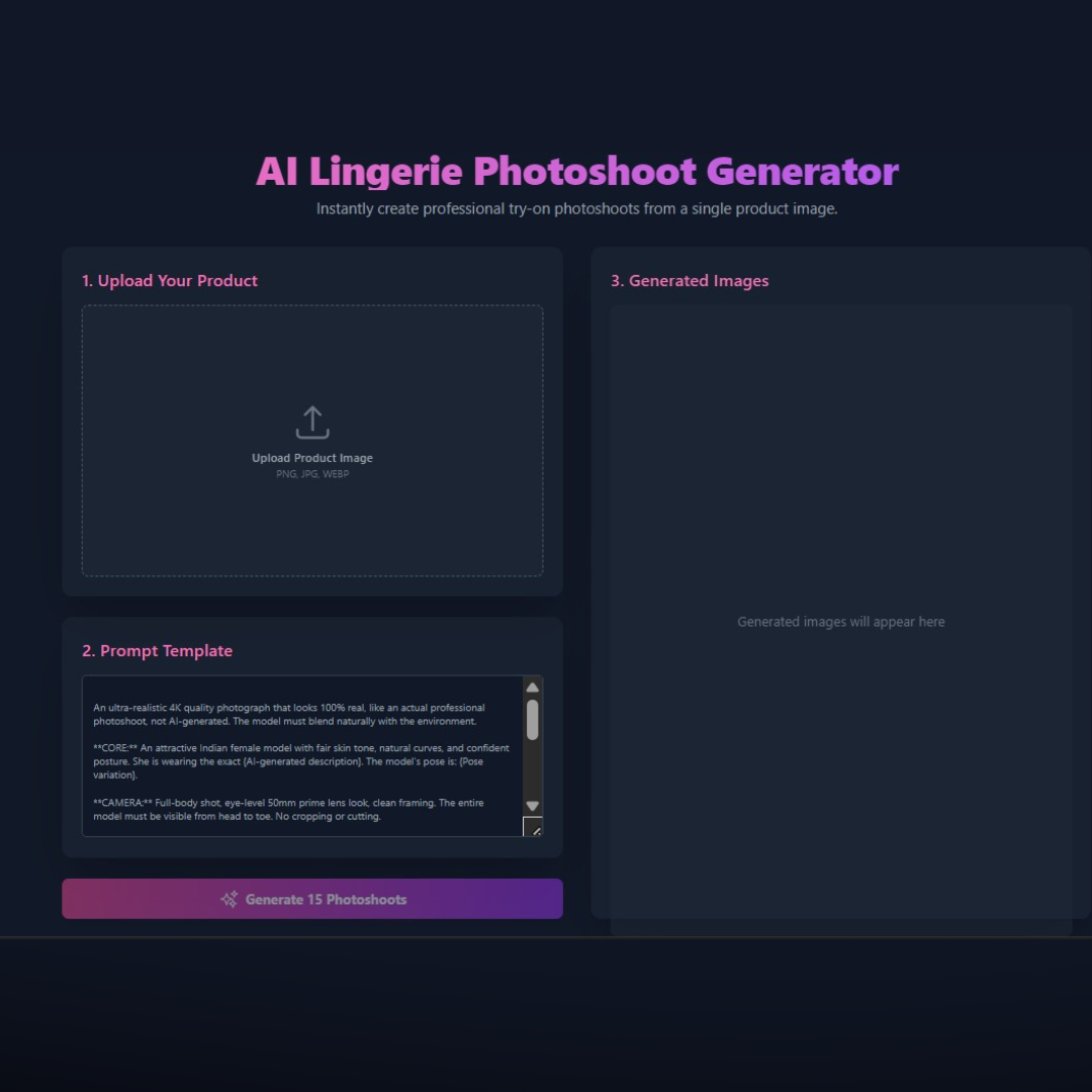Get Started: Upload your lingerie product image and let the AI generate elegant, high-quality photoshoot visuals perfect for eCommerce listings, lookbooks, or digital campaigns.