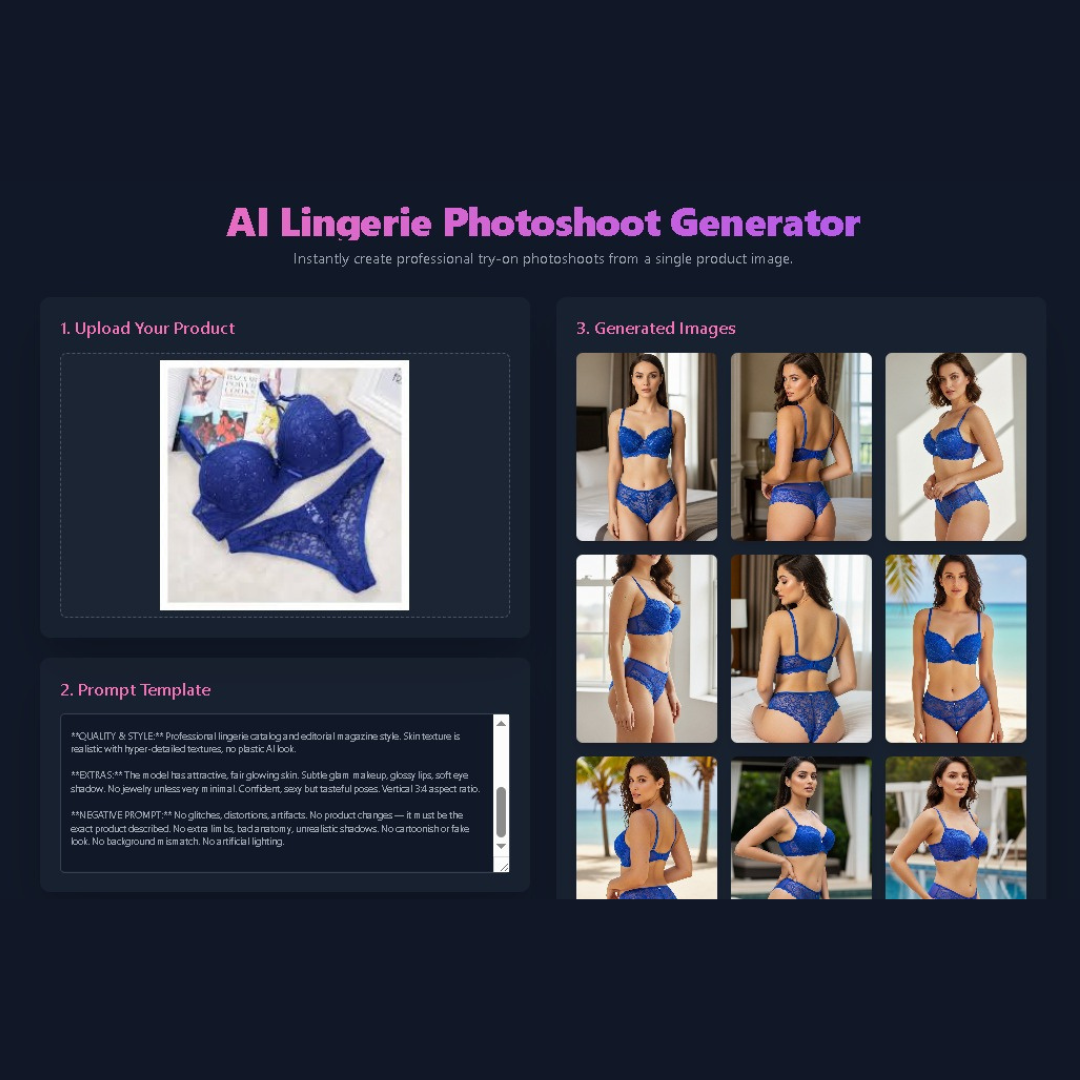 Generate professional AI-powered lingerie photoshoot visuals in multiple poses and settings.