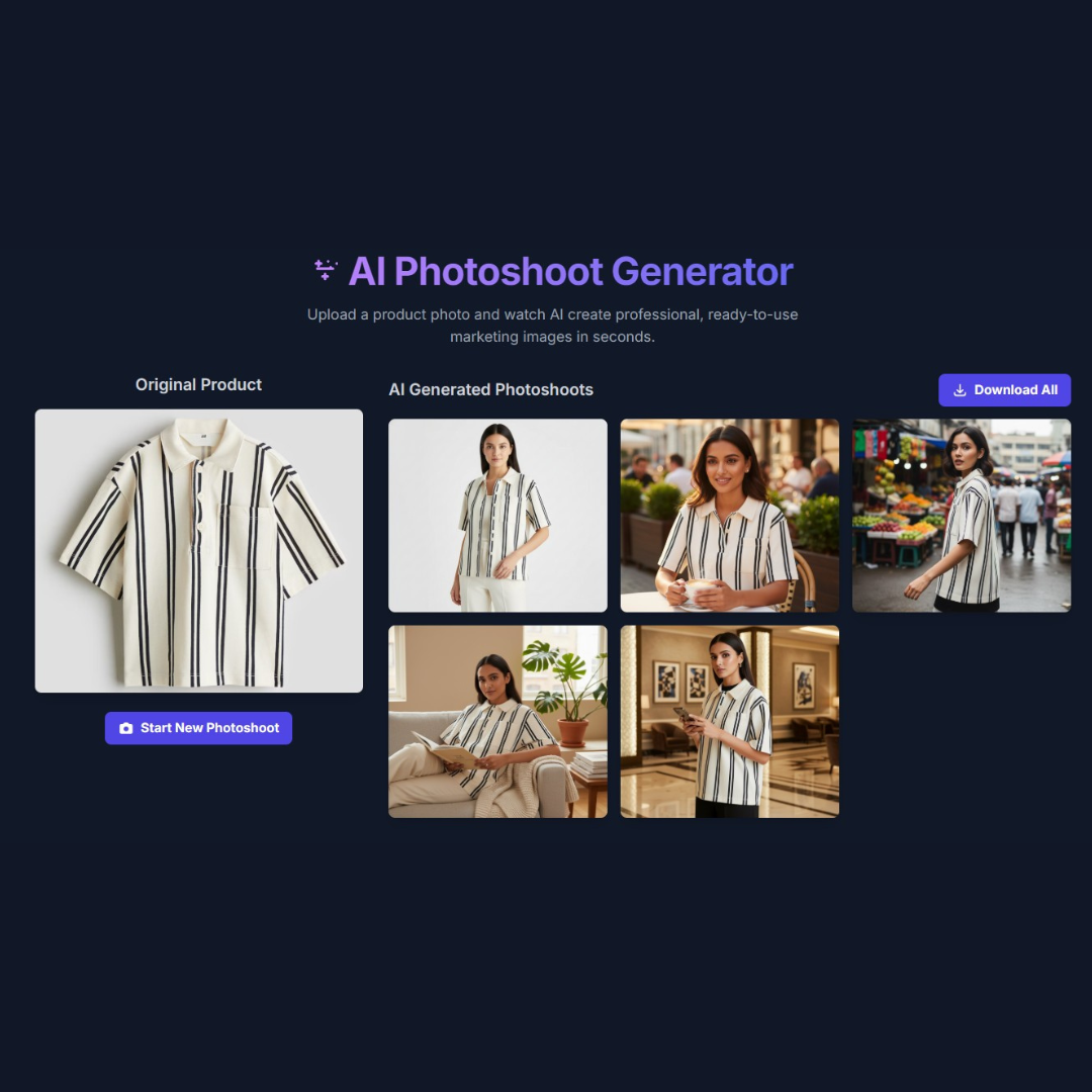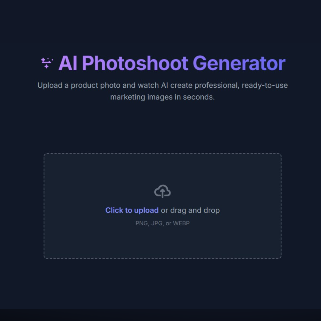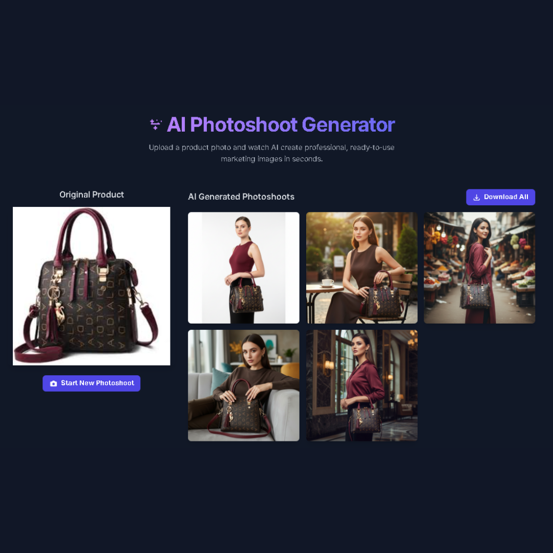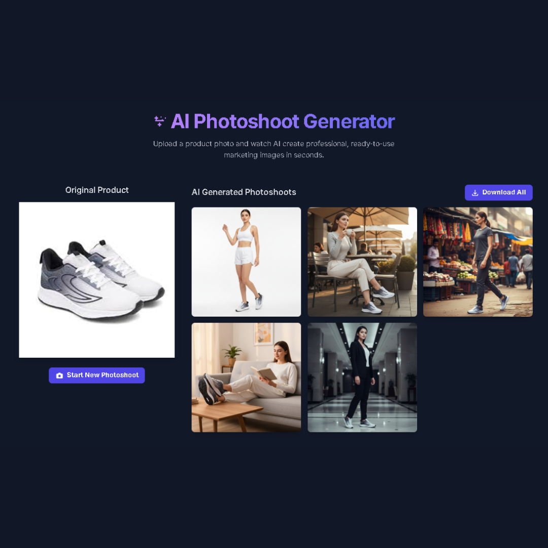 Get Started:Simply upload any product image and get 5 ready-to-use AI-generated photoshoot visuals to elevate your brand presentation.