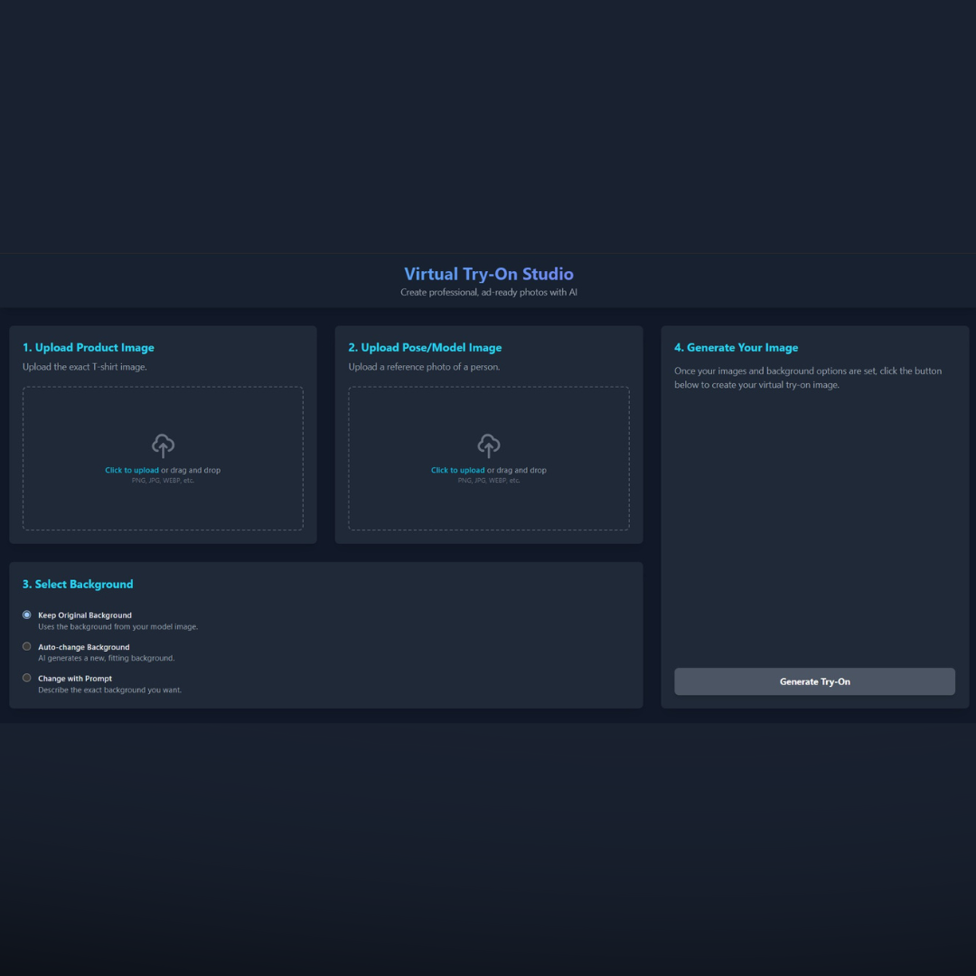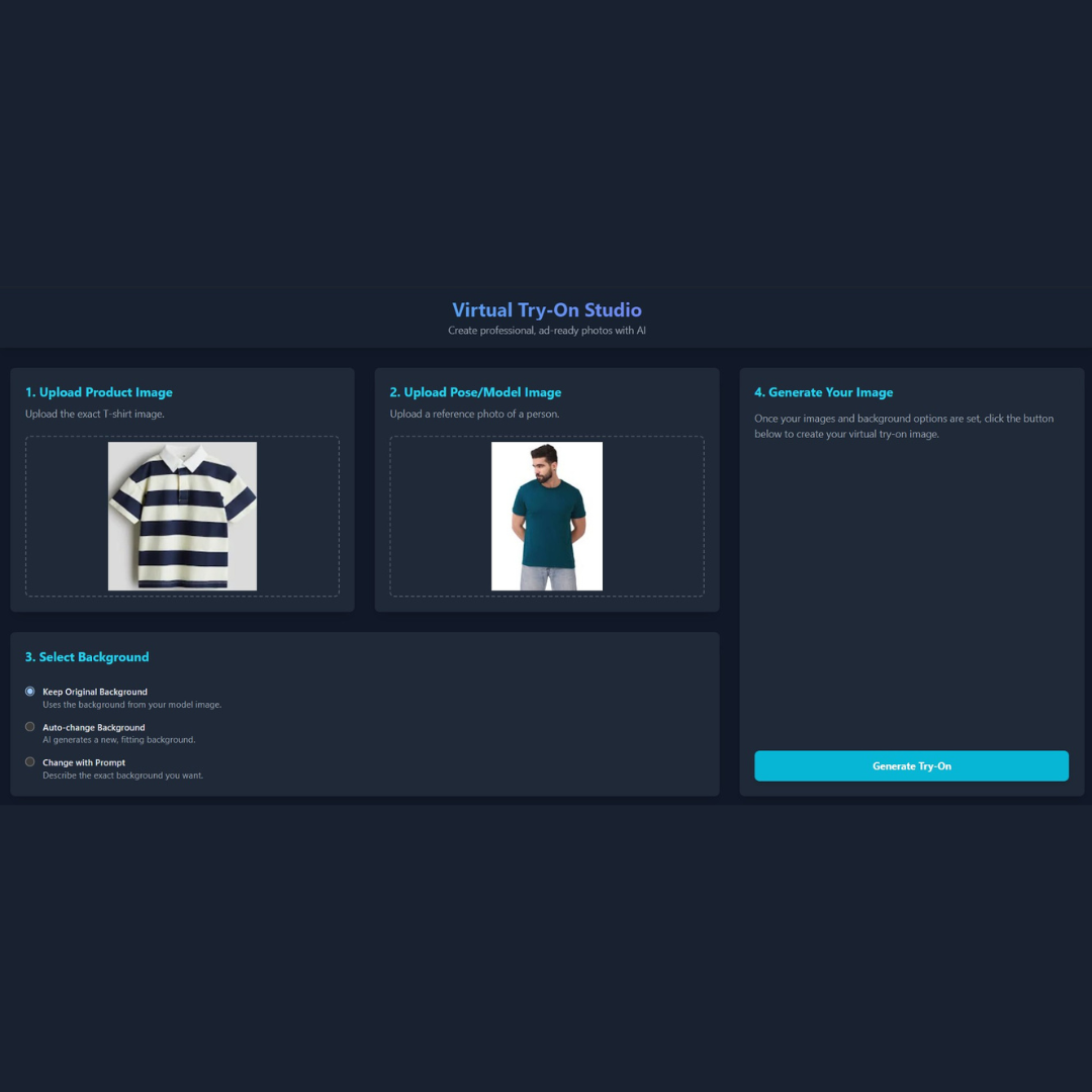 Get Started: Upload your t-shirt and model photos to instantly generate professional try-on visuals. Ideal for quick mockups, online store images, or creative campaigns.
