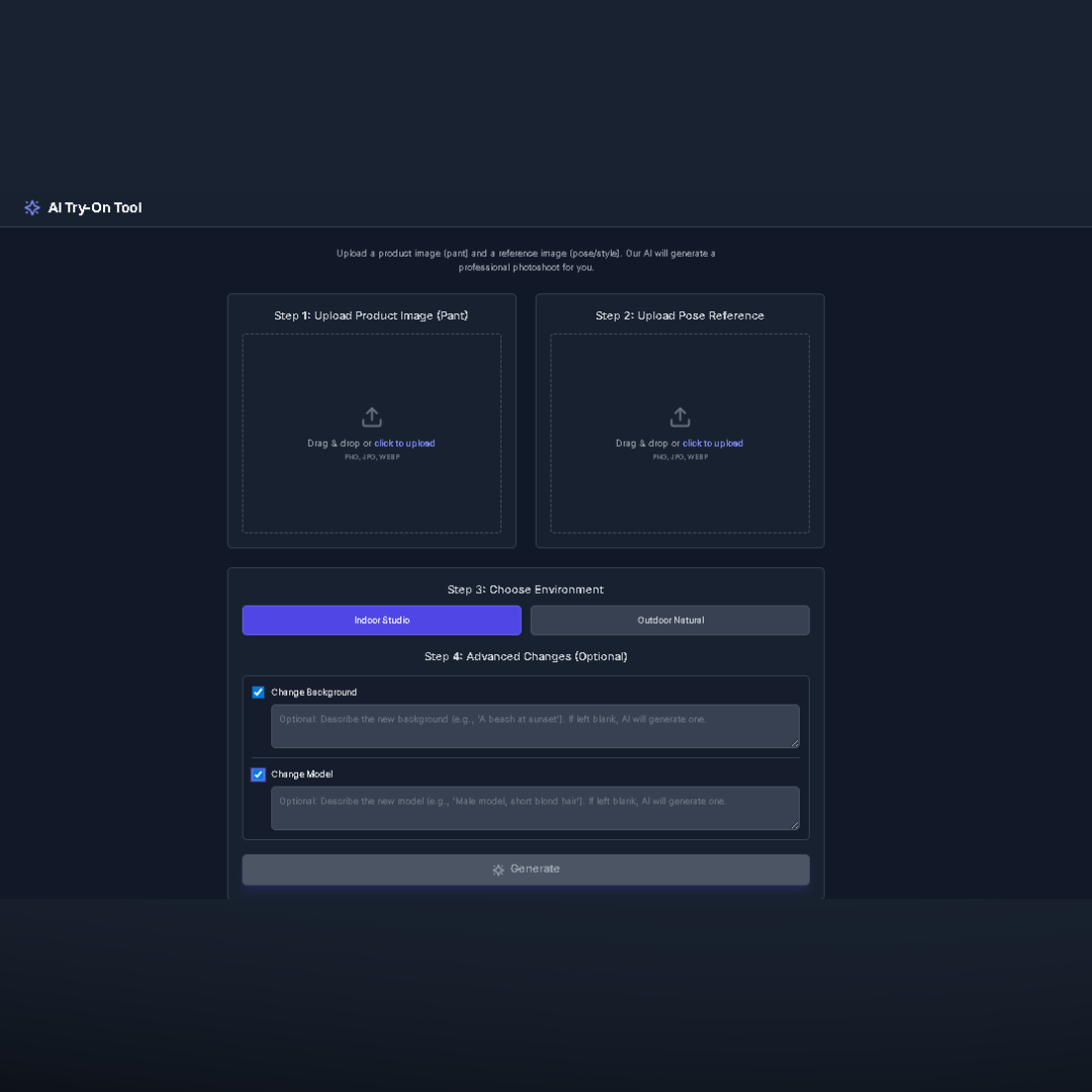 Get Started: Upload your pant and model pose images, select the desired background style, and let AI generate realistic, ready-to-use photoshoot visuals for your fashion catalog or online store.