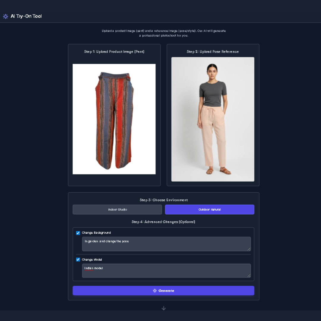 - Generate Results: Click Generateto produce a high-quality, realistic try-on image with automatic lighting, fitting, and background integration.