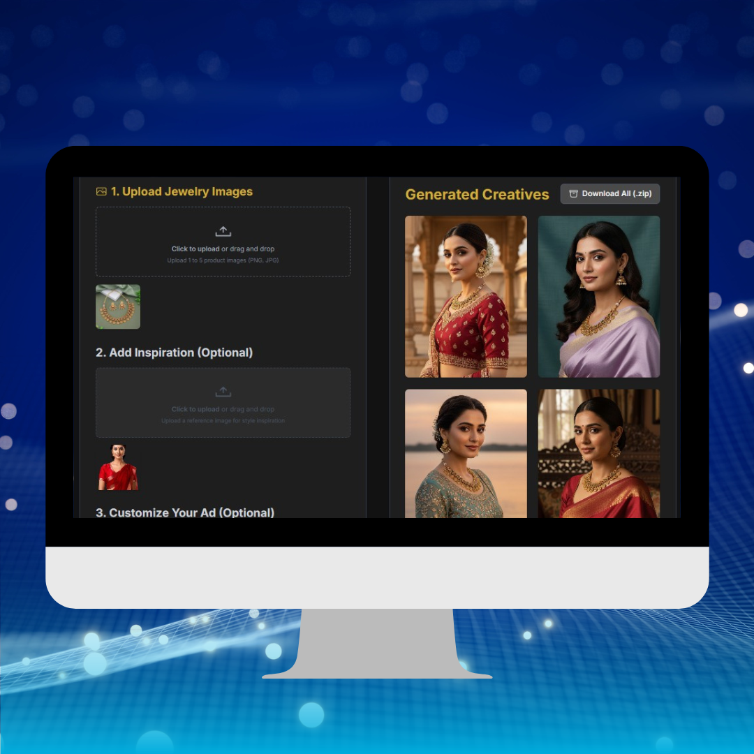 Get Started: Upload your jewelry and inspiration images to instantly create premium-quality visuals for websites, ads, or social media promotions.